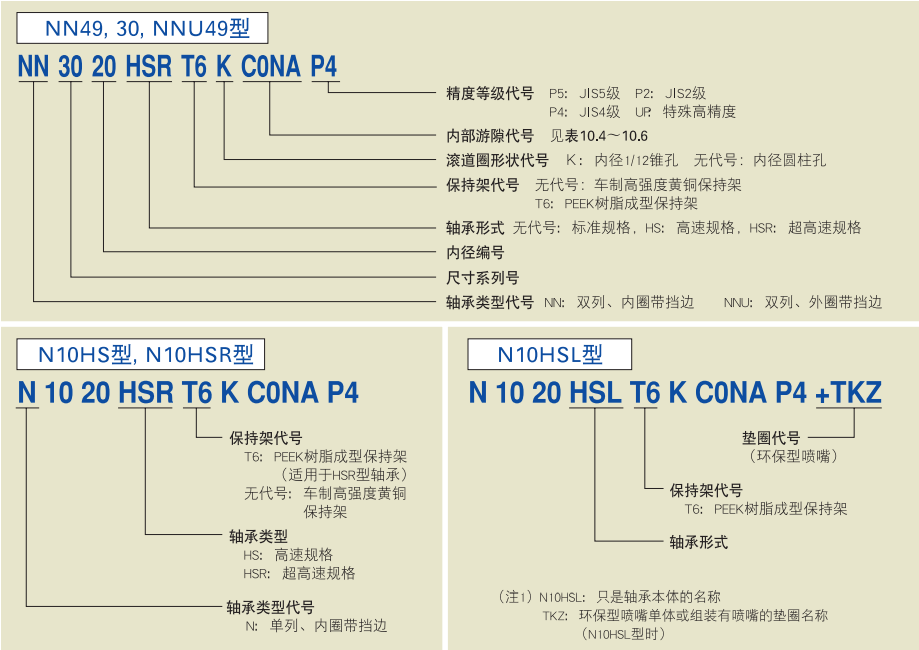 軸承形式有標(biāo)準(zhǔn)型和高速規(guī)格的HS型兩種。標(biāo)準(zhǔn)保持架為車制高強(qiáng)度黃銅保持架。