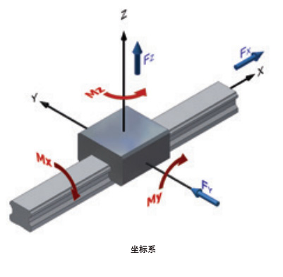 線性導軌可以通過力或扭矩施加應力。坐標系(如下圖)顯示了主要荷載方向上的作用力、扭矩以及六個自由度。